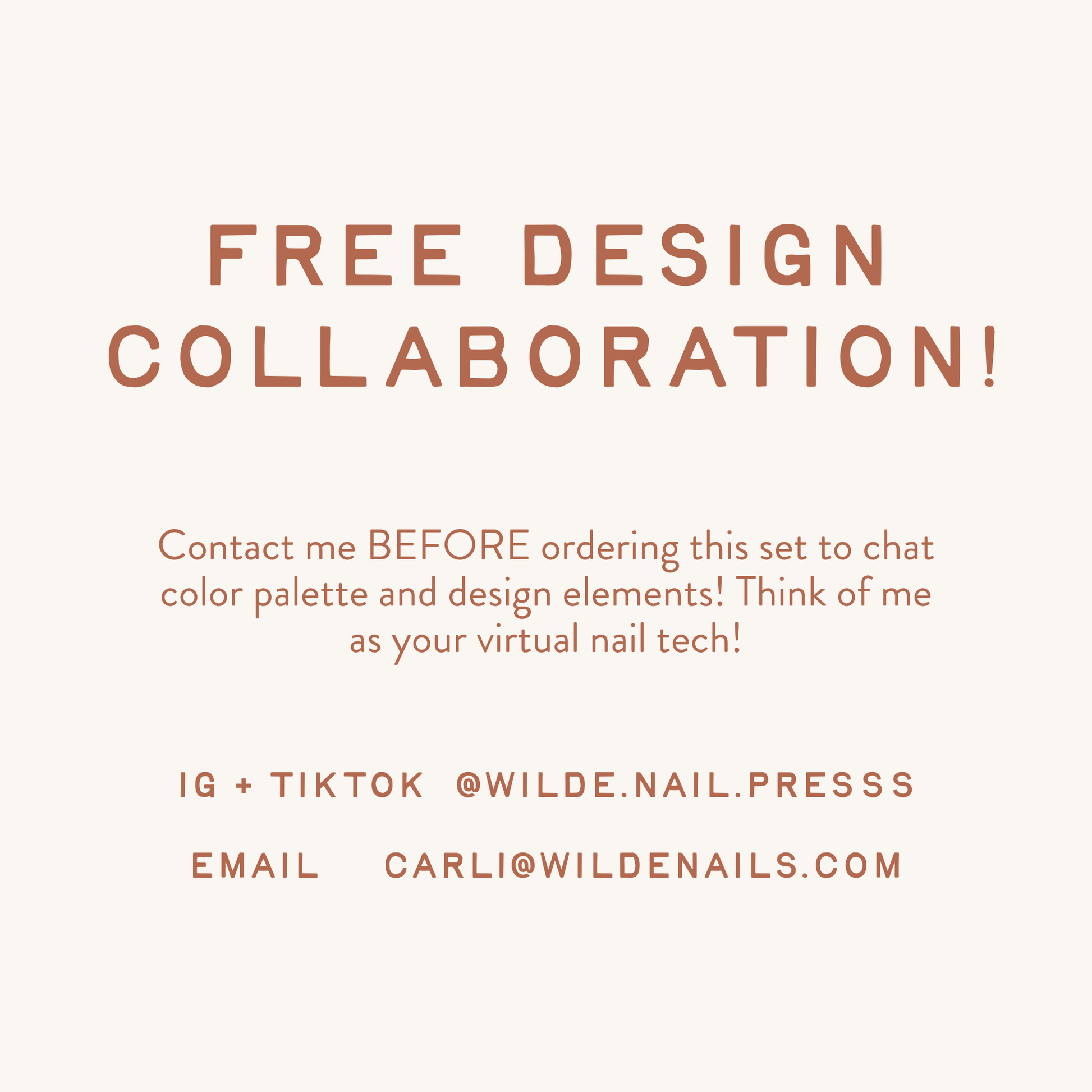 2. 💌 Always reach out before you purchase: DM or email me to start the process. Include: nail sizes, set(s) you’re interested in, desired shape & length for each set and color/design inspo. IG/TikTok: @wilde.nail.presss or email me at carli@wildenails.com